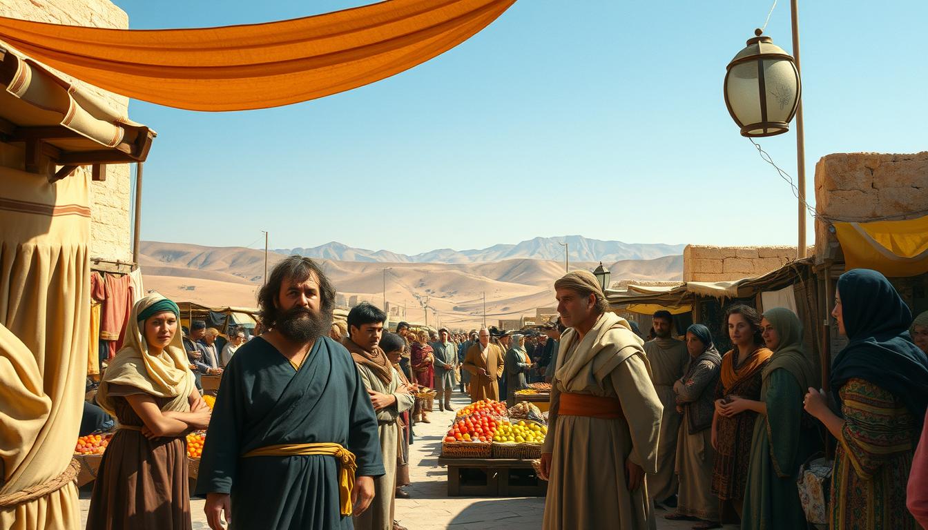 Betrachten Sie auch die Geschlechterrollen kritisch. Eine Frau verkleidet sich als Mann, um an einer Steinigung teilzunehmen. Diese Szene kommentiert gesellschaftliche Ausschlüsse.